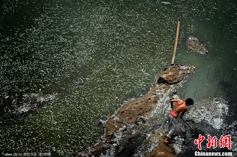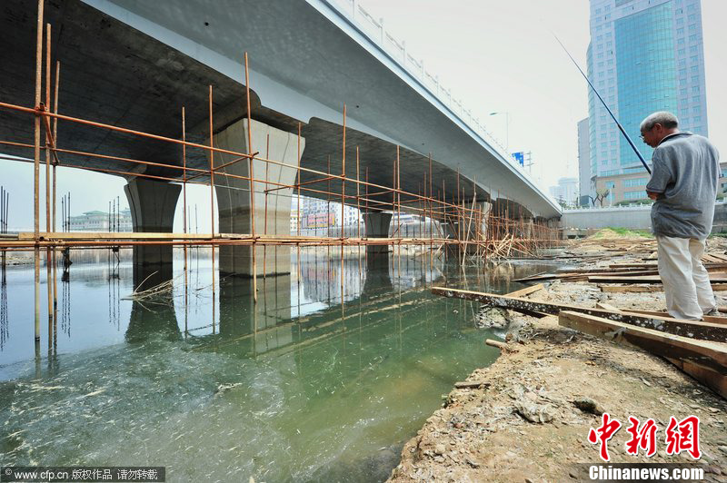 2011年8月17日,江西南昌城區撫河上的兩座新橋橋面已經鋪上了瀝青,再有個把月,撫河故道上的橋將增加到7座。隨著工程進度的加快,臨時筑起的一東一西兩條攔河壩間大概200米的一段水域,卻成了魚兒的地獄。因為河水長時間不流動,高溫下,這里的河水已是濃稠烏黑如同柏油,死魚混雜著一團團灰色泡沫密密麻麻漂浮在水面上,白白的蛆蟲在死魚中游來拱去,臭水味和死魚腐爛的腥臭味隨風飄散,50米外就有惡臭撲鼻而來。楊靜 攝 圖片來源:CFP視覺中國