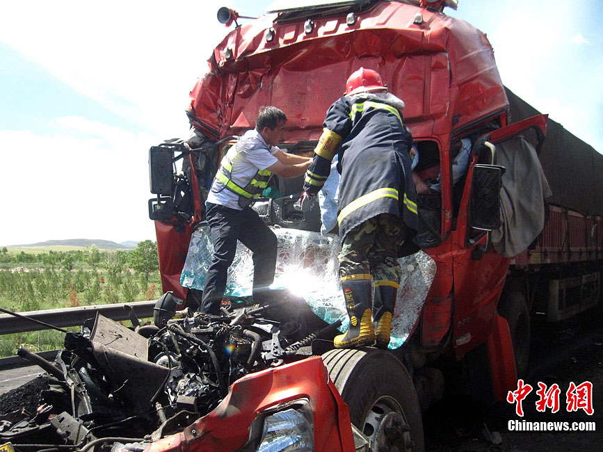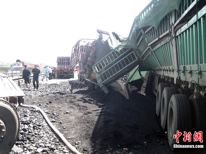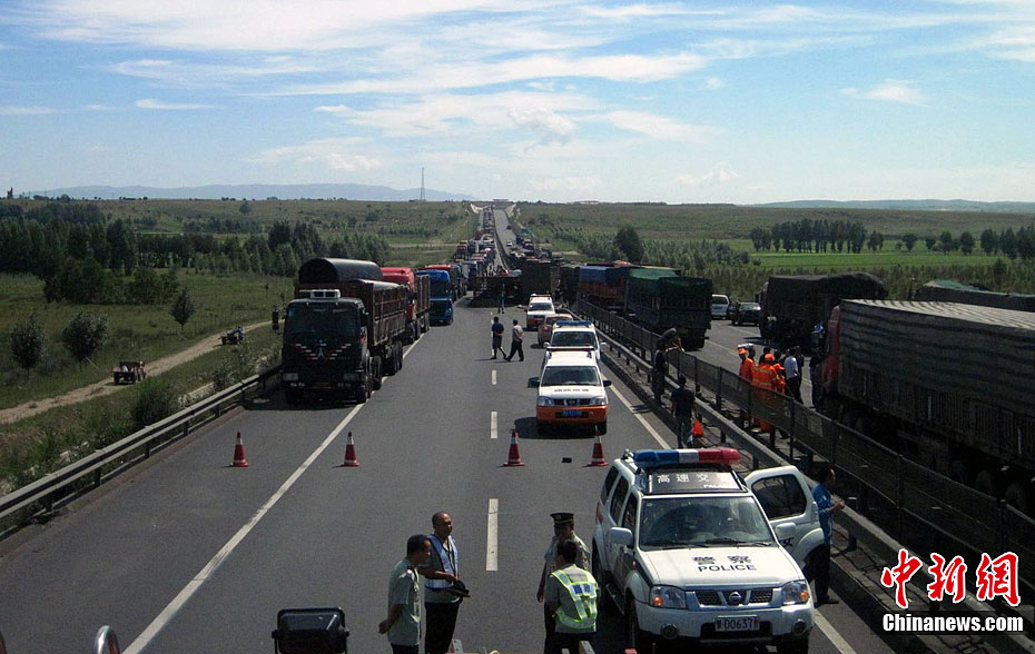 京藏高速內蒙古集寧段8月18日早晨發生30多輛貨車連環相撞事故,目前已造成6死5傷。圖為事發現場。中新社發 張龍里 攝