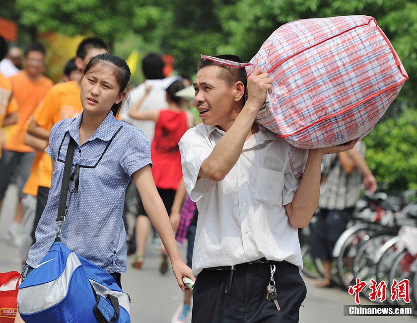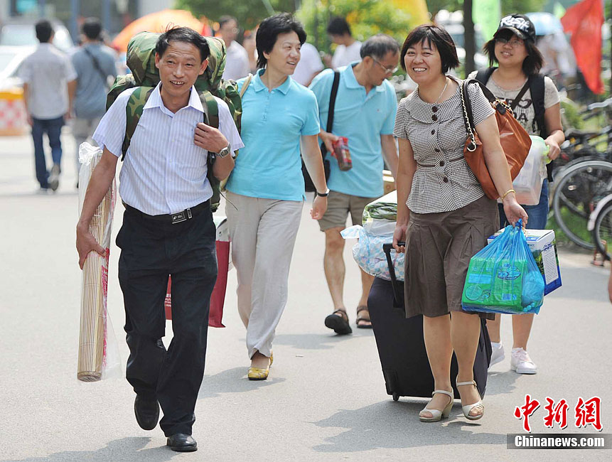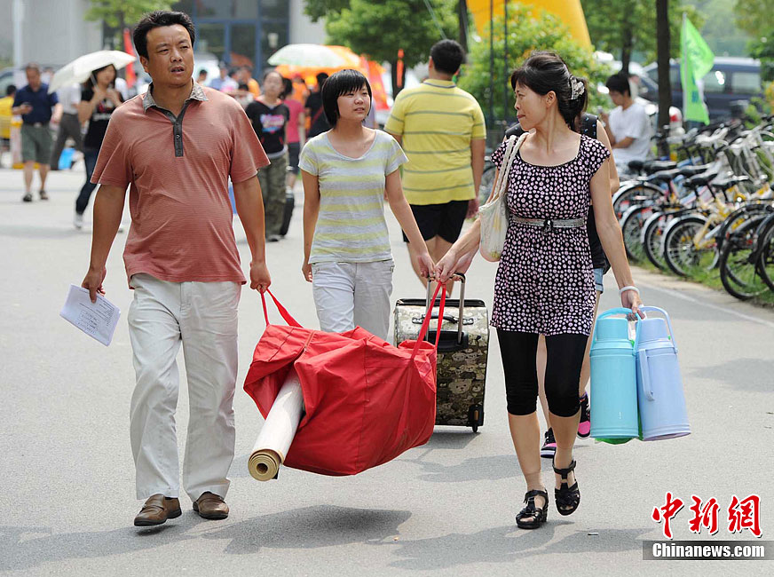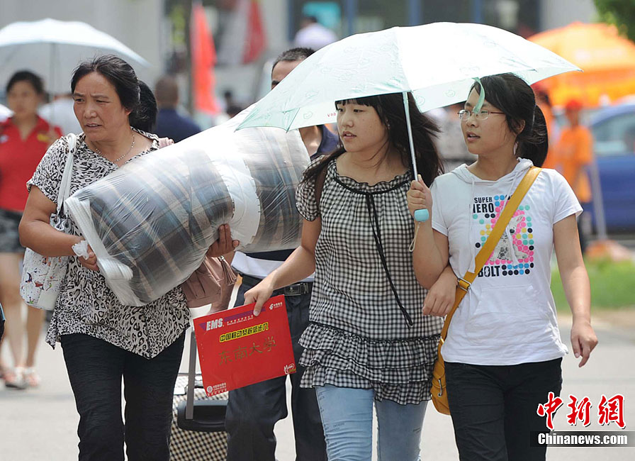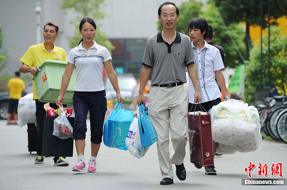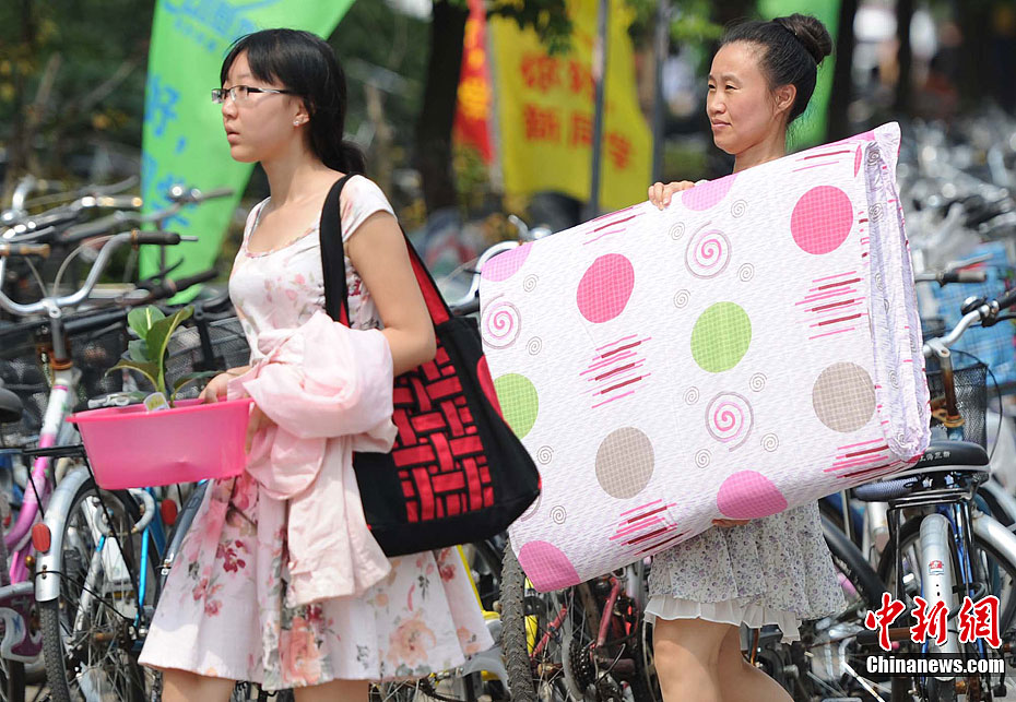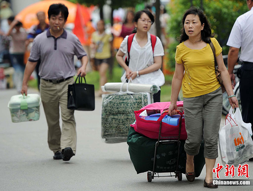 8月20日,南京東南大學迎來了首批“學生潮”。眾多新生帶著席子、被褥,電扇、手機、MP3乃至MP5、PSP、電腦前來報到。雖然學校和社會近年不斷發出新生獨自入學、培養獨立能力的倡議,但家長對孩子考上大學的喜悅和執著的愛,讓他們難卻陪送的腳步,龐大的新生“親友團”依然是大學校園迎新時節的一道風景。泱波 攝