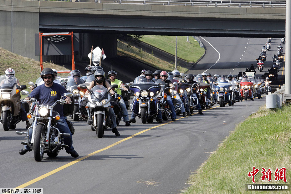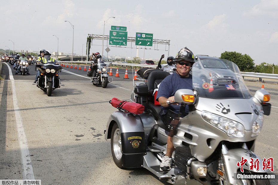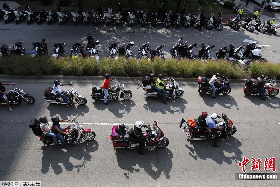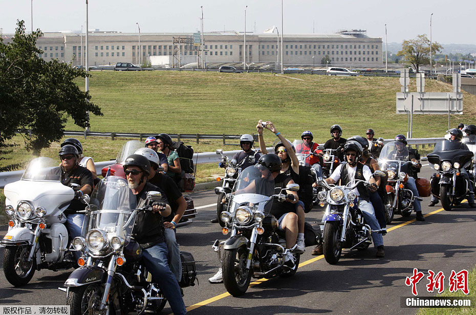 近2500名美國摩托車手于18日開始進行摩托車騎行活動,以紀念“9·11”恐怖襲擊事件十周年。參加騎行活動的摩托車手們于19日前往華盛頓市郊的五角大樓“9·11”紀念園,悼念那里的遇難者。據悉,摩托車騎行活動由美國“9·11”基金會發起,2001年11月舉行了首次騎行,隨后每年舉行一次。
