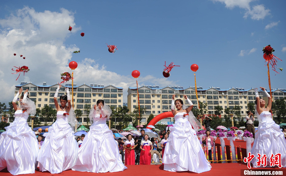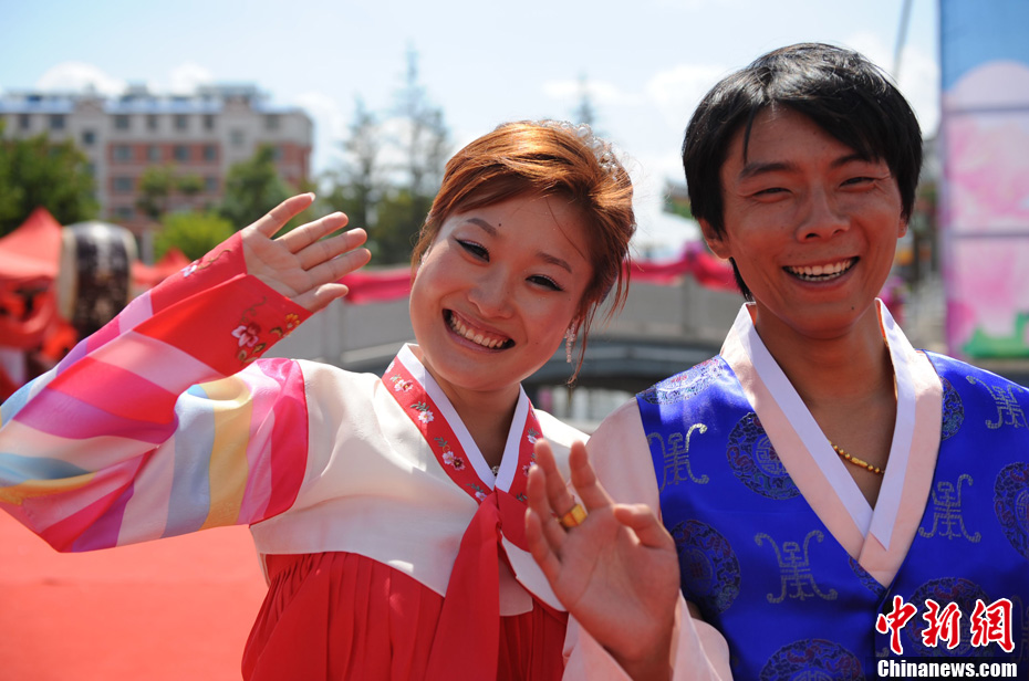 8月25日,由國家人口計生委和中國人口宣傳教育中心舉辦的“2011·中國幸福家庭萬里行”暨“吉林延邊長白山年人口文化節(jié)”在延吉開幕。為慶祝這一活動,和龍市舉辦首屆以“長白山下金達(dá)萊,花開為媒連真愛”為主題的大齡青年集體婚禮,19對朝鮮族和漢族新人采用漢、朝兩種婚俗形式喜結(jié)良緣。中新社發(fā) 曾利明 攝