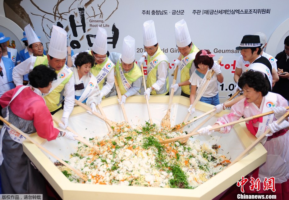 8月25日,韓國官員與志愿者在首都首爾共同制作巨型人參拌飯,宣傳2011年世界人參博覽會。本屆世界人參博覽會將于9月2日在韓國錦山開幕