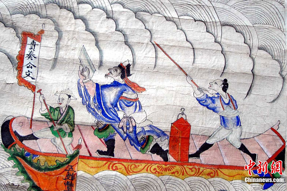 日前,江西省遂川縣雩田鎮衡溪“古南鄉蔣氏宗祠”在進行拆舊維修時,工作人員在宗祠中廳的屋檐下,發現一幅彩色巨型古畫。該畫長2.2米,寬1.98米,畫工筆法細膩,線條明快流暢,色澤瑰麗鮮艷,人物栩栩如生。畫上繪有人物292個,衣著紋飾精美,面部神態逼真,表情豐富多彩,神態動作各異。目前,衡溪蔣氏家族已將古畫移交該縣博物館保存。由于沒有題跋印章,該畫的具體繪制年代還有待于進一步考證。李建平 攝