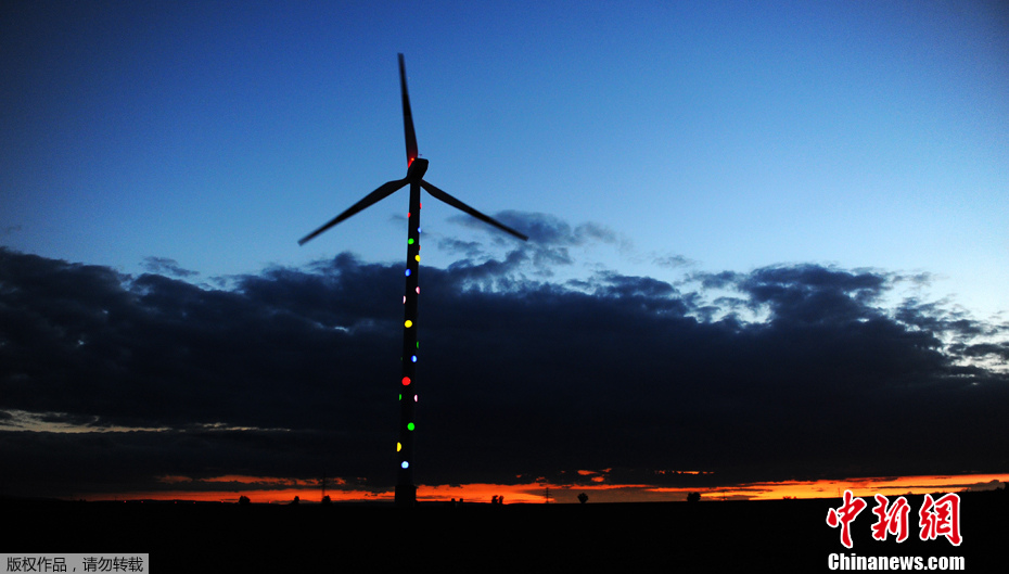 9月5日,在德國北部城市漢諾威,一名男子站在一座裝配了彩燈的風力發電機前。這套燈光裝置由法國藝術家帕特里克·雷諾設計,在2000年漢諾威世博會時亮相。根據設計原理,彩燈的能源由風力發電機提供,并且風力越大,燈光越亮。
