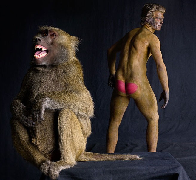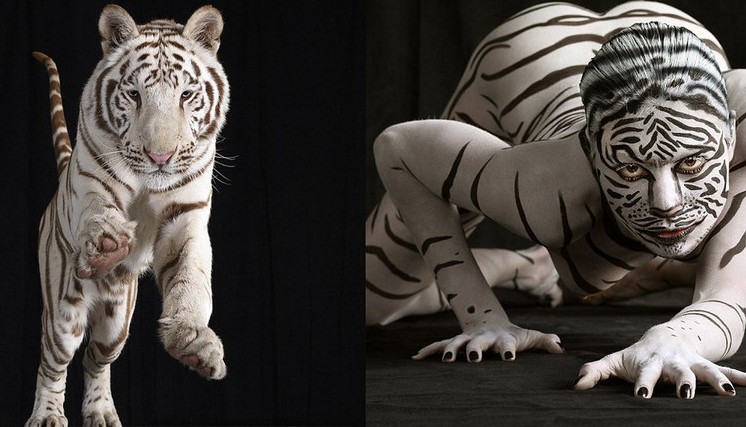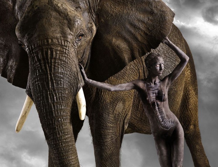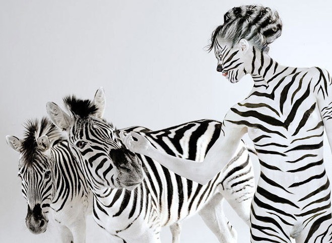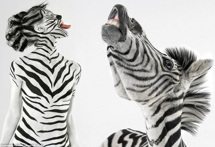 擅長拍攝野生動物的美國攝影師萊內特·尼維爾(Lennette Newell's)又在加州展出新作品,不過此次相片主角不僅是野生動物,還有“化身”動物的裸體模特。此次攝影展滿足了攝影師萊內特愿人類和動物融為一體的童年夢想。照片中模特不再是人的模樣,而被畫成斑馬、大象、狒狒甚至獵豹,并和“同類”一同入鏡。不過,萊內特使用了極其豐富多變的色彩表現出人和野生動物之間的不同。