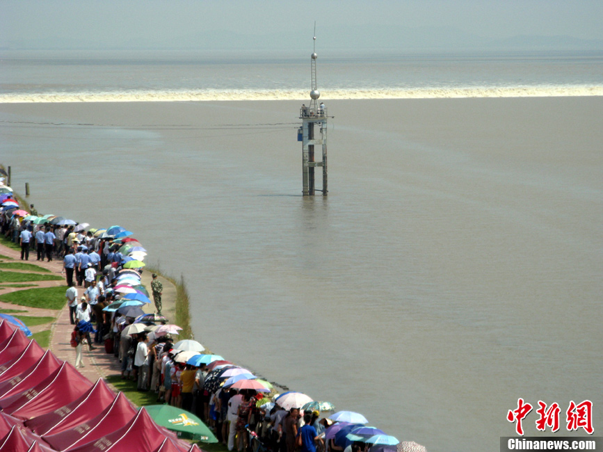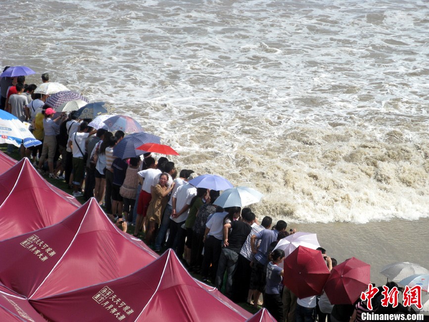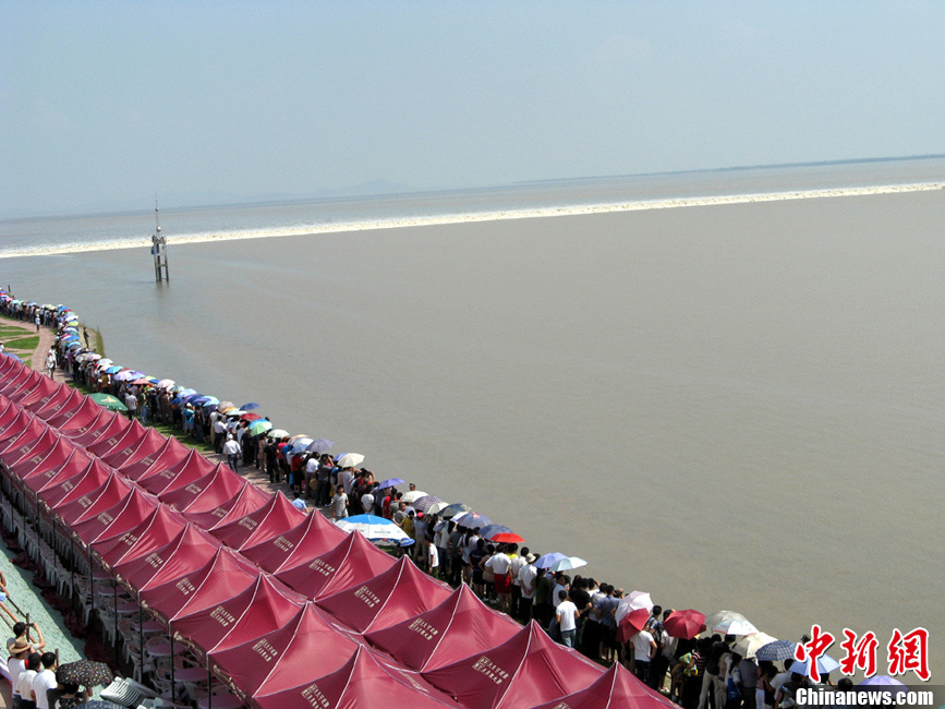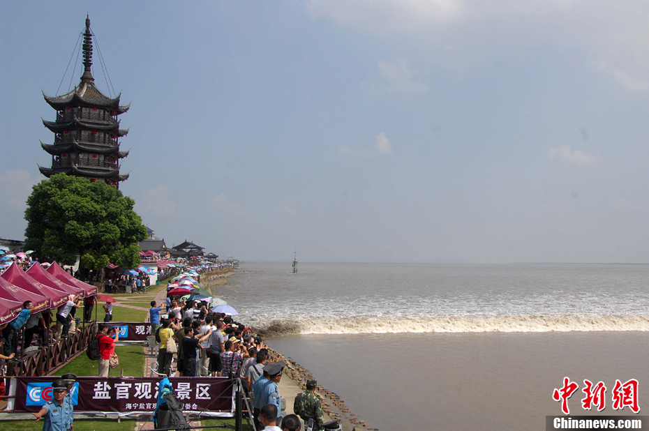 9月14日,在觀潮勝地浙江海寧鹽官景區,錢塘江蔚為壯觀的“一線潮”吸引了各地觀眾的目光。當天是農歷八月十七,據杭州水文信息網報,鹽官觀潮等級已經升至觀潮最高等級5級。中新社發 沈達 攝 圖片來源:CNSPHOTO