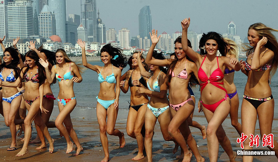 9月22日,來自全球73個國家和地區參加第36屆國際比基尼小姐大賽全球總決賽的佳麗匯聚山東青島,圖為各國參賽的比基尼佳麗亮相青島海邊。中新社發 錢興強 攝