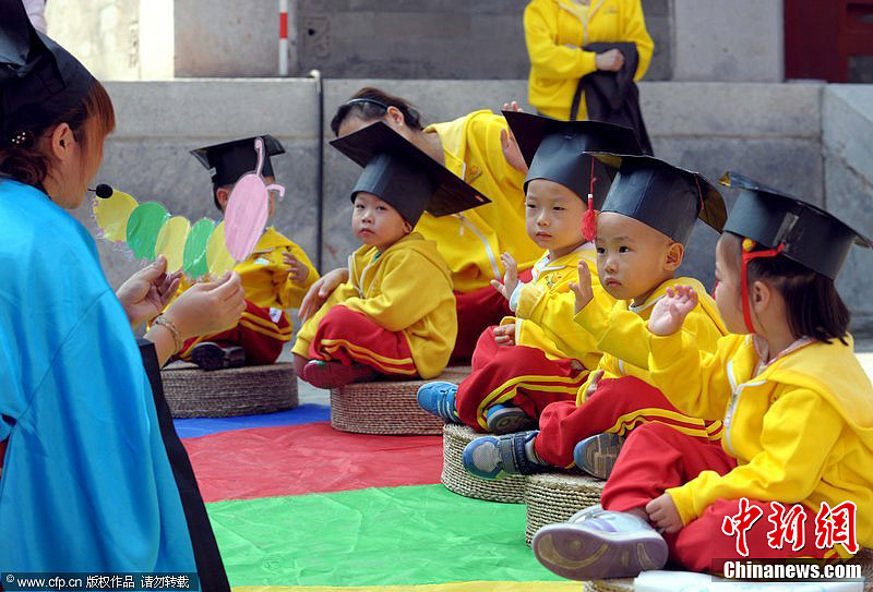 9月23日,北京朝陽東方子楹雙語幼兒園將國學(xué)課堂開進(jìn)了國子監(jiān)孔廟,199名小朋友圍坐在一起上國學(xué)課、做國學(xué)操。孩子們用童聲朗誦著《弟子規(guī)》、《百家姓》、《三字經(jīng)》等國學(xué)力作,大班的幼兒還練起了中國功夫。圖為小朋友圍坐在一起上國學(xué)課、做國學(xué)操。歐陽曉菲 攝 圖片來源:CFP視覺中國