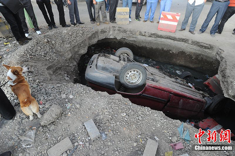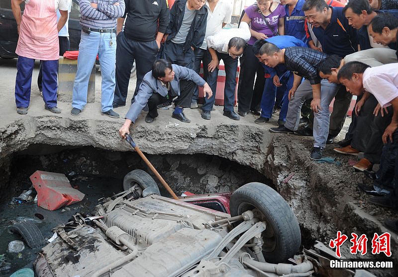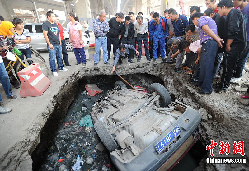 9月26日,天津,塘沽海河大橋下的新港三號路上,一輛轎車不慎駛入路面大坑內,“底朝天”困在坑內的積水中。現場一位好心市民用木棍將門撬開,檢查車內是否有人。小小 攝 圖片來源:CFP視覺中國