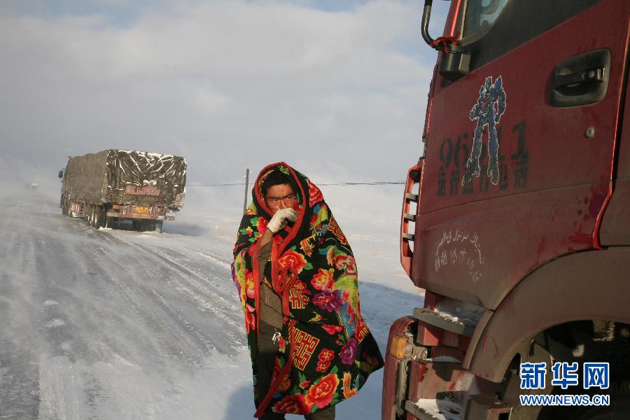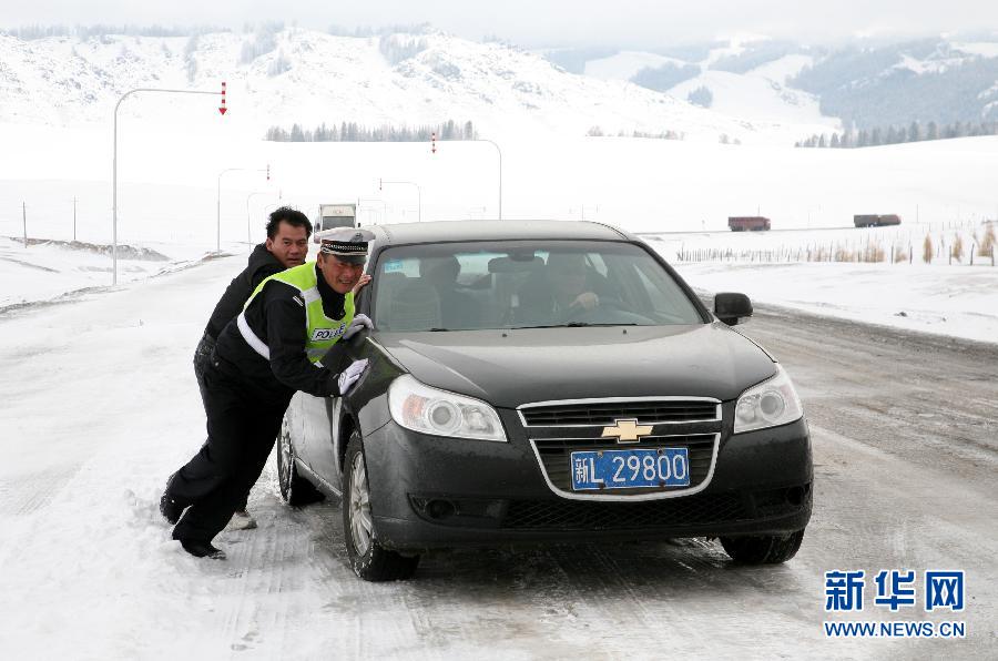 10月12日,交警在新疆303省道哈密段疏導交通。受冷空氣影響,10月11日至12日凌晨,新疆哈密北部沿天山一帶出現(xiàn)風雪降溫天氣,造成302、303省道部分路段積雪結冰,能見度不足百米,302省道全線和303省道天山路段被迫臨時關閉。新華社發(fā)(蔡增樂 攝)圖片來源:新華網(wǎng)