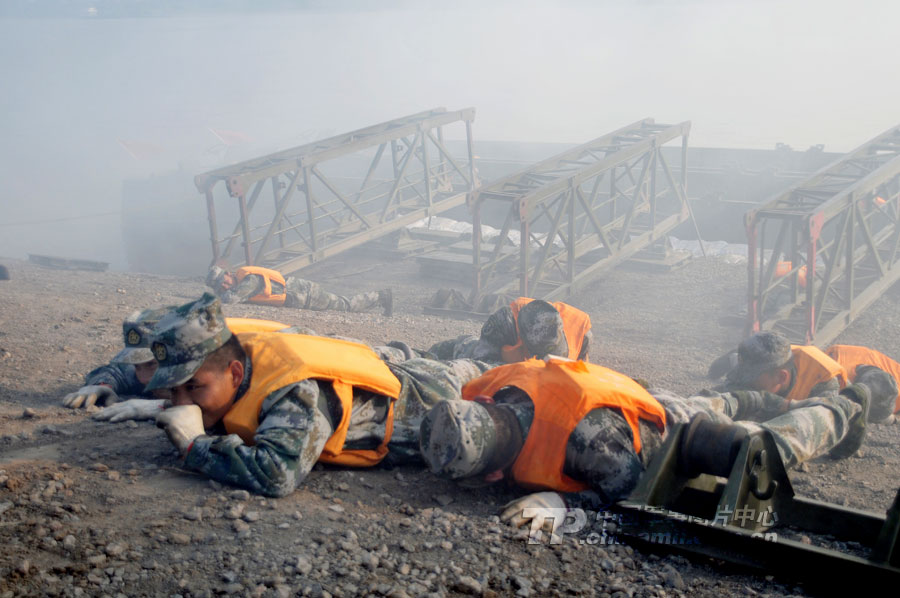 22分鐘,在長江上架起一座600多米的鋼鐵浮橋?你相信嗎?日前,記者走進廣州軍區某舟橋旅野訓場,舟橋官兵用實際行動證實了此言非虛。當日上午9點,隨著某舟橋旅旅長邱啟建的一聲令下,兩顆紅色信號彈騰空而起,在長江湖北某水域浮橋渡口、門橋渡口、假浮橋渡口同時展開作業。隱蔽在長江沿岸的假浮橋編隊、新型特舟編隊、門橋編隊,如同離弦的劍,迅速駛向預定浮橋渡場。一時間,江面上成為了官兵拼搏的戰場,構筑我岸和對岸碼頭、門橋連接、火炮渡送,官兵們激戰正酣。
