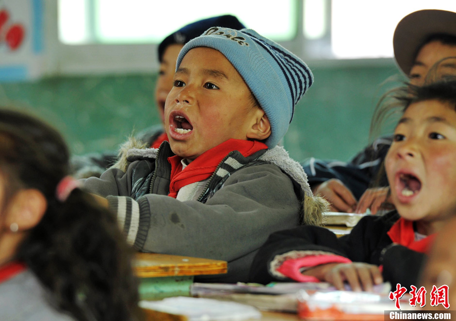 四川阿壩州馬爾康縣腳木足鄉中心小學距縣城41公里,海拔3000多米,成立于1954年,是一所全寄宿制小學,學校有136名學生和21名教職工,7個教學班。學校僅有一棟主教學樓,另外兩棟小樓是教師學生宿舍和食堂。該校老師既要完成繁重的教學任務,又要照顧好學生們吃和住等日常生活。圖為一年級一班正在上課的6歲女生德斯基。中新社發 劉忠俊 攝