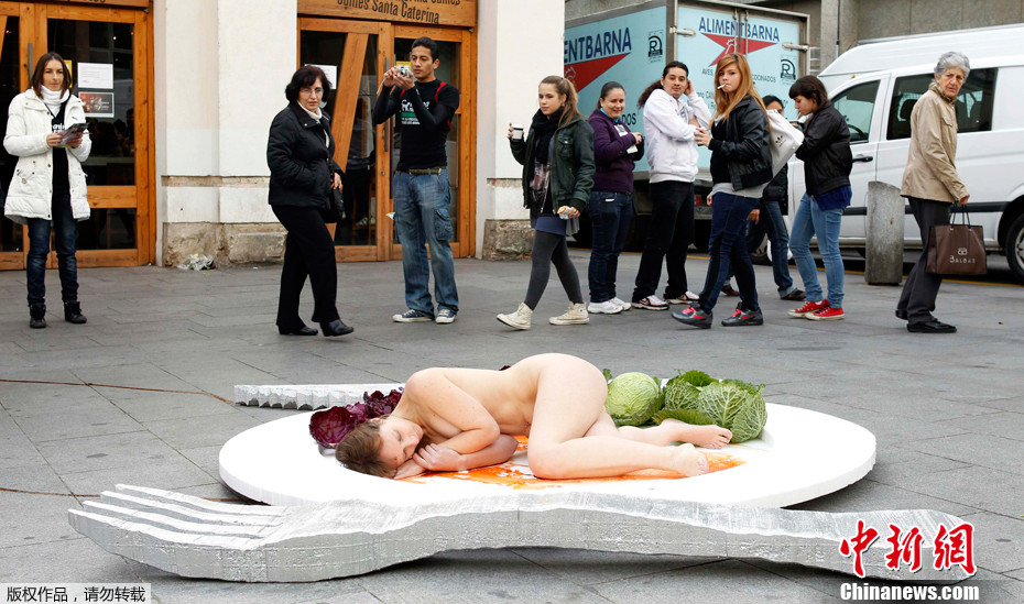 當地時間2011年12月15日,西班牙巴塞羅那,保護動物組織成員裸體躺在盤子中,抗議肉類消費。