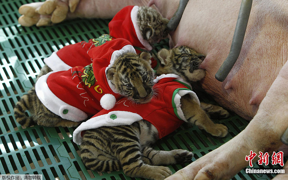 12月24日,泰國春武里府動物園內虎崽穿著“圣誕老人”的服裝,迎接圣誕節的到來。