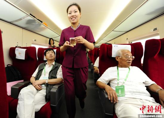 據山東商報 6月17日上午,京滬高鐵試運行情況向媒體開放,圖為高鐵列車服務員為一等座車廂的“乘客”端茶送水。京滬高鐵運營初期,計劃每天安排開行動車組列車90對,實行時速300公里和250公里混跑模式。從北京到上海最短時間為4小時48分鐘。時速300公里動車組列車從北京到上海全程票價二等座555元,一等座935元,商務座 (包括觀光座、一等包座)1750元;時速250公里動車組列車全程票價二等座410元,一...