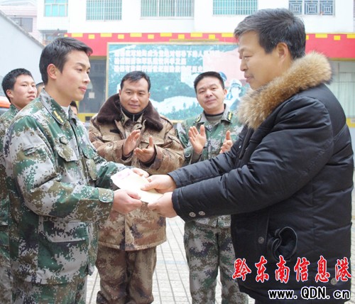 黎平縣人武部民兵應急骨干分隊班長歐益偉在協同特警中隊長趙光欽執勤巡邏過程中,面對手持兇器的歹徒,毫不畏懼,徒手浴血擒賊,在身上多處被歹徒刺傷的情況下,仍然頑強與歹徒進行殊死搏斗,最終將歹徒擒獲,受到了黎平廣大人民群眾的高度贊揚。黔東南州人民政府為歐益偉記“二等功”,并榮獲第二屆全省道德模范提名獎。圖為1月28日縣委宣傳部文明辦曹東升同志為歐益偉送去慰問金的情景。(周志光 攝)