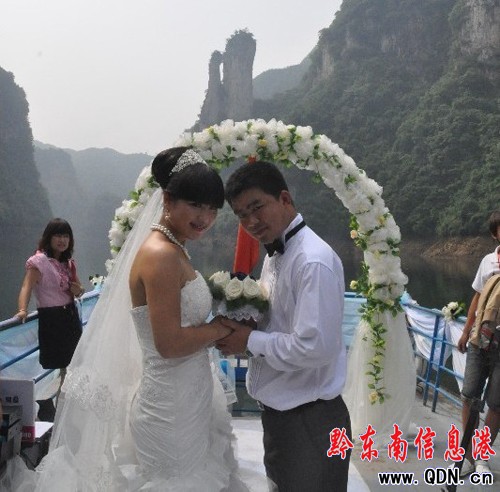 6月12日,天氣晴好,一對喝著氵舞陽河水長大的戀人懷著感恩的心,在國家級風景名勝區——貴州氵舞陽河上舉行了浪漫的婚禮,氵舞陽河上的“孔雀石”見證了這一美好時刻。