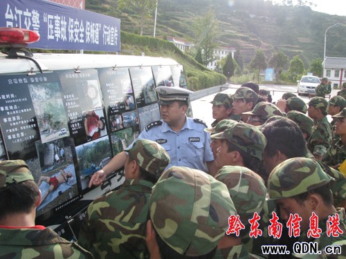 8月18日,臺江縣交警大隊宣傳民警到縣民族中學為1000多名參加軍訓的高一新生進行了一次交通安全宣傳教育活動,通過上交通安全知識課、發放宣傳資料、組織觀看事故展板等,送軍訓新生安全“大餐”,受到了新生們一致好評。圖為宣傳民警在給學生講解交通安全知識的情景。(唐光新 金貴華)