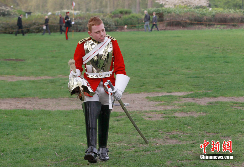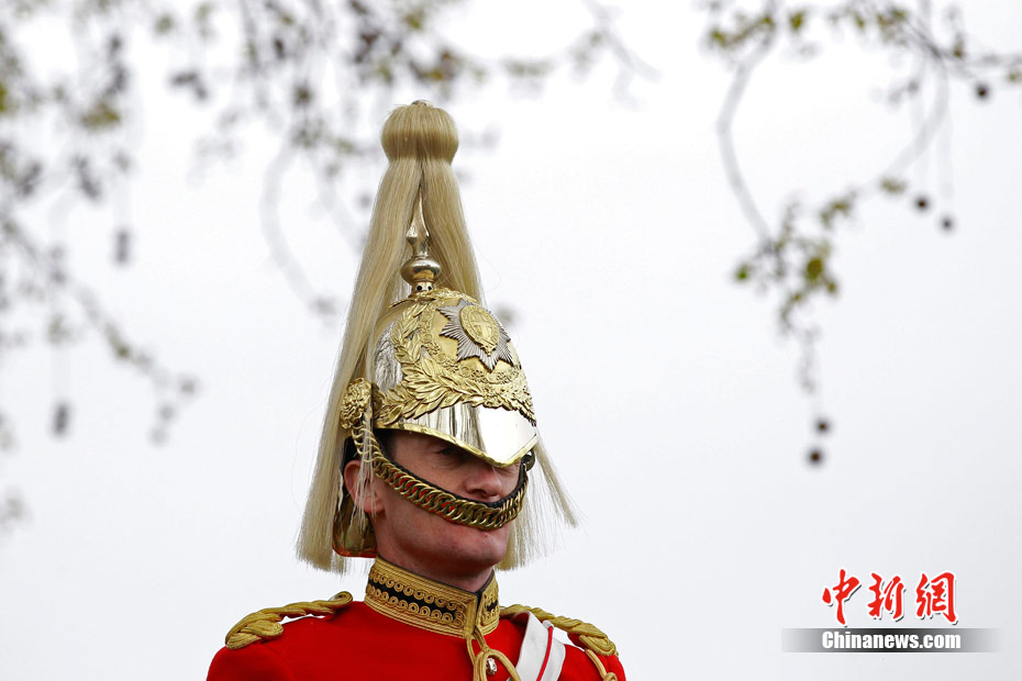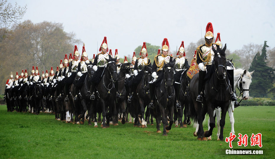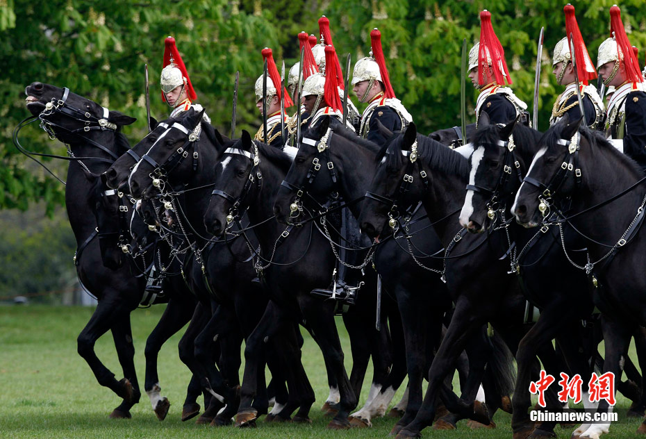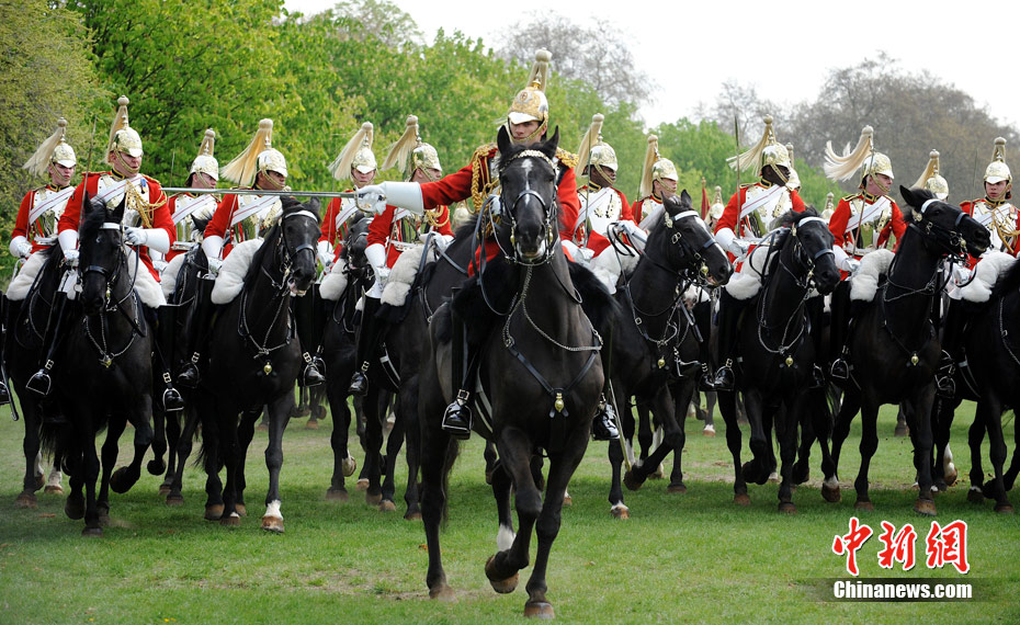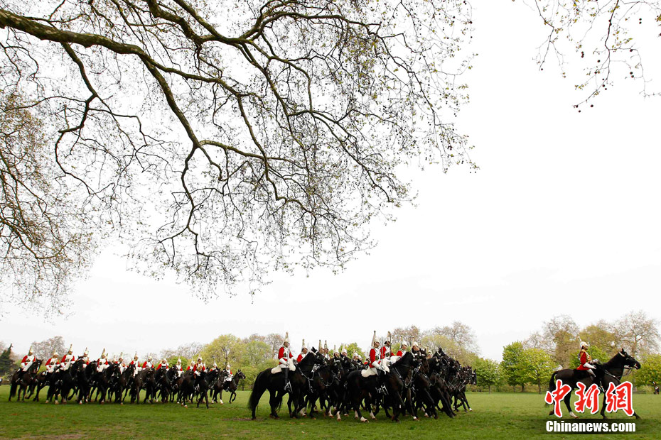 2011年4月14日,英國(guó)倫敦海德公園,英國(guó)皇家騎兵隊(duì)在為一周后的閱兵舉行演習(xí)。皇家騎兵隊(duì)將在4月21日接受少將的檢閱,以求達(dá)到重大儀式的儀仗標(biāo)準(zhǔn),并為4月29日即將到來(lái)的王室婚禮做最后的準(zhǔn)備。