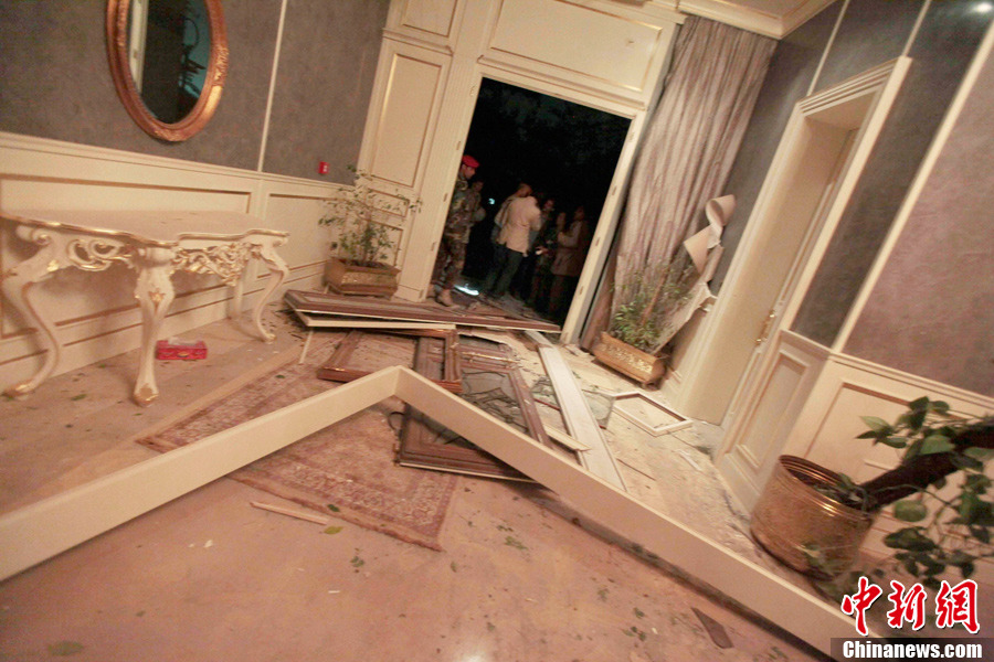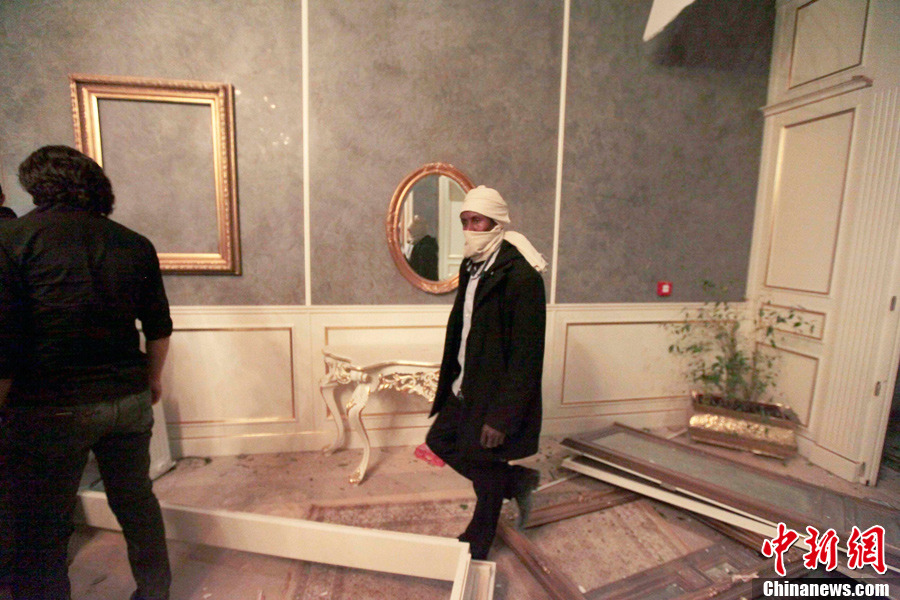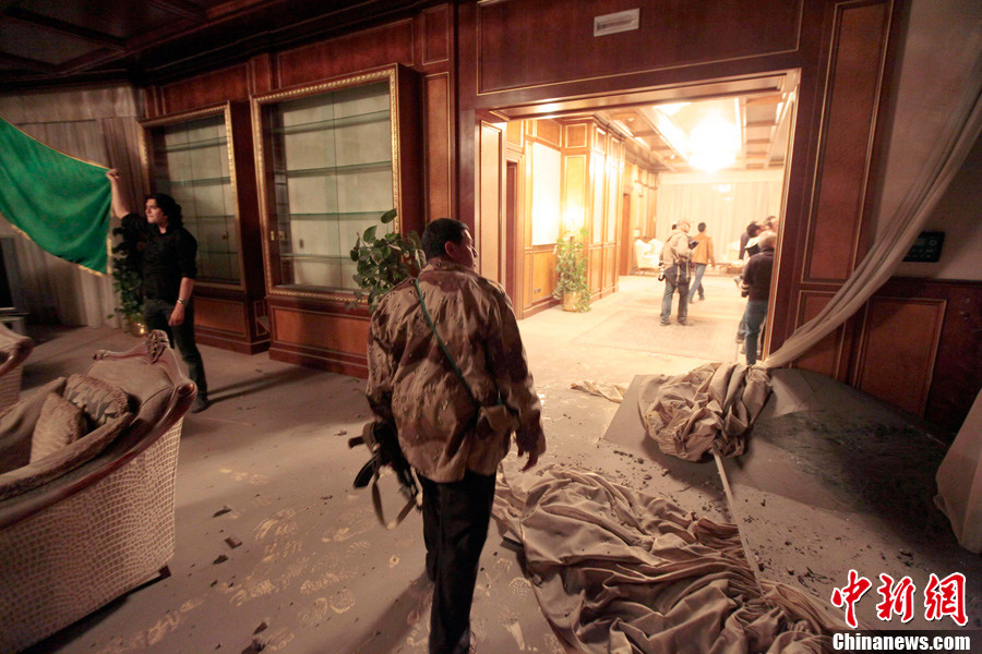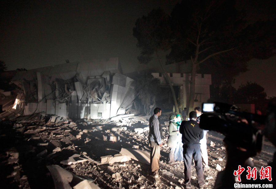 4月25日,在利比亞首都的黎波里,一名男子站在被轟炸的利比亞領導人卡扎菲的辦公樓前。北約戰(zhàn)機25日凌晨對利比亞領導人卡扎菲在的黎波里的一處辦公樓實施轟炸。利比亞政府官員譴責北約企圖殺害卡扎菲,并稱轟炸造成45人受傷、卡扎菲辦公室受損嚴重。