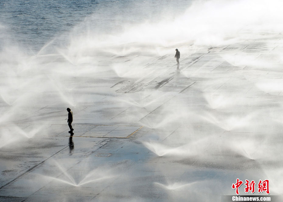 2012年9月19日,正在大連改裝的16號航母平臺懸掛滿旗,身著海軍制服的人在甲板上進行了疑似站坡儀式。懸掛滿旗只有在特別重大的節日或重大活動表示隆重時,軍艦才會懸掛。(本組圖片特別鳴謝 新浪微博@特警4587的馬甲提供現場圖片)