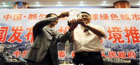 全球人居環境論壇秘書長呂海峰向都勻頒發“全球綠色城市”水晶獎杯