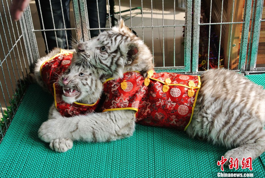 2012年1月16日,山東青島森林野生動物世界2只小孟加拉白虎在嬉戲。當日,是我國北方農歷小年。在山東青島森林野生動物世界出生的一對2月大的龍鳳雙胞胎孟加拉虎穿上喜慶新衣與游人見面,喜迎小年。中新社發 俞方平 攝 圖片來源:CNSPHOTO