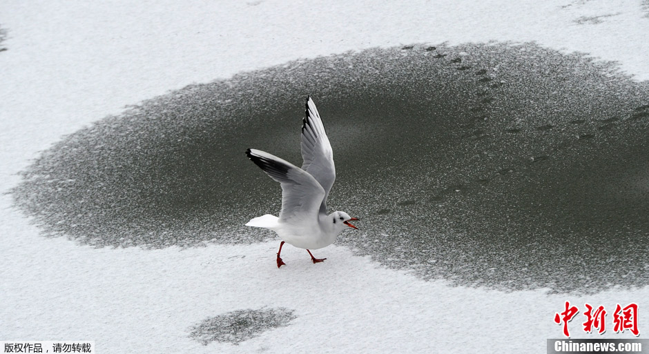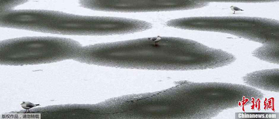 當地時間1月15日,德國柏林,一群鷗飛過部分解凍的湖面。當天柏林迎來了今年的第一場雪,氣溫保持在冰點。