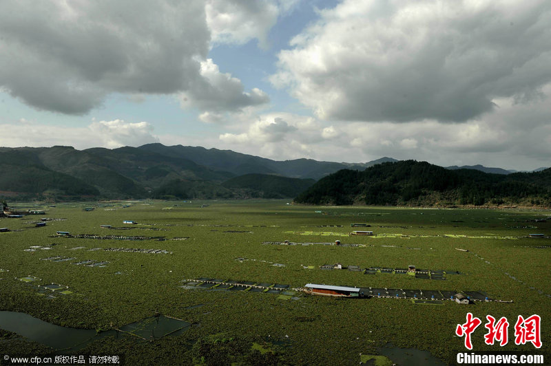 1月31日,福建寧德市古田縣水口鎮(zhèn)灣口村段,浩浩蕩蕩的水葫蘆延綿閩江近10公里,如同草原。2011年,該鎮(zhèn)400多養(yǎng)殖戶的網(wǎng)箱遭遇大面積死亡現(xiàn)象損失上億元,今年養(yǎng)殖區(qū)又遭水葫蘆圍困魚苗都無法放養(yǎng)。柳濤 攝 圖片來源:CFP視覺中國