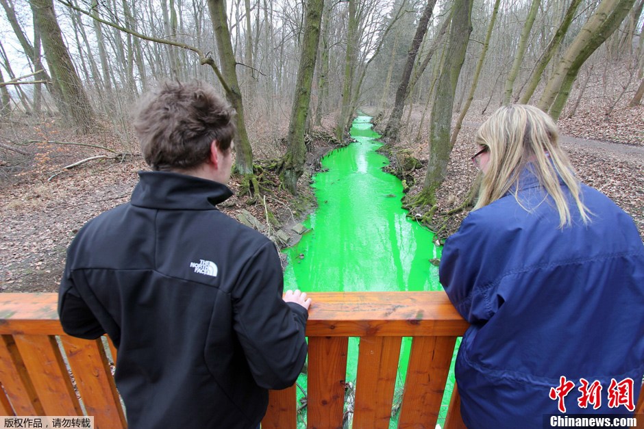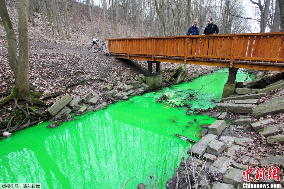 3月2日,在德國中部下薩克森州的哥廷根,有兩條相鄰的小溪,但其顏色卻截然不同。一條是普通的小溪,另一條卻因為化學污染變成綠色的溪流。據悉,這條綠色的小溪是由于附近的一個工廠在遭遇火災后,工廠內的化學物質流入小溪而致。