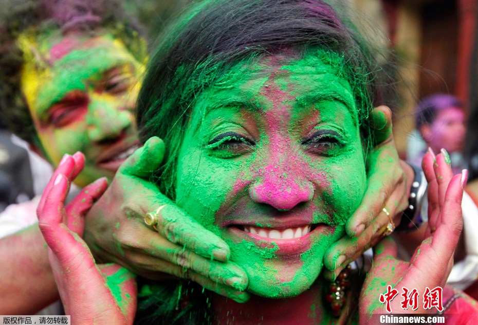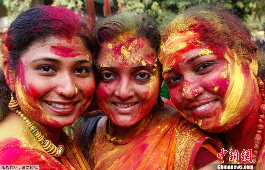 2012年3月6日,印度加爾各答,人們載歌載舞,盡情地用五彩繽紛的顏色裝扮起來歡慶胡里節(jié),迎接春天的到來。