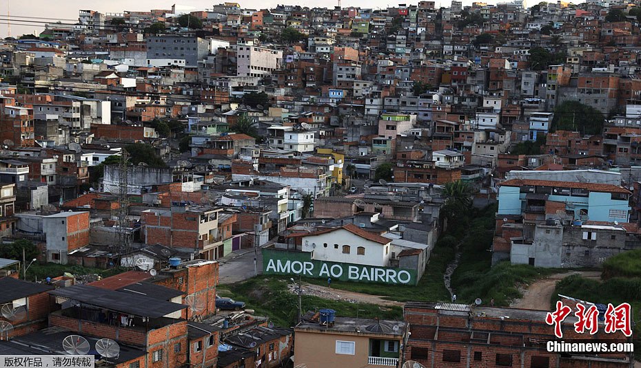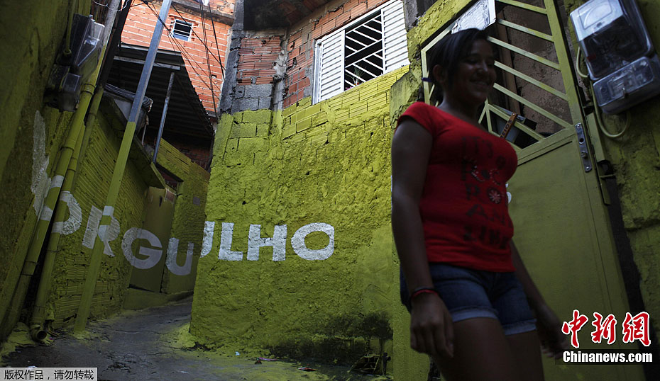 3月6日,巴西圣保羅,Brasilandia街區的一條街道上,彩色的墻上涂寫的各種巨大白色葡萄牙語單詞。彩色墻壁和字母涂鴉是5位西班牙藝術家的“街道之光”藝術項目的一部分,它是在圣保羅Brasilandia貧民區居民的幫助下實現的。