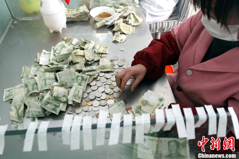3月14日上午,在公交公司財務處記者看到:桌上、地上堆疊著一捆捆、一摞摞的一元紙幣和硬幣,員工正排著隊接過一沓沓的零錢裝進隨身攜帶的購物袋或包里。