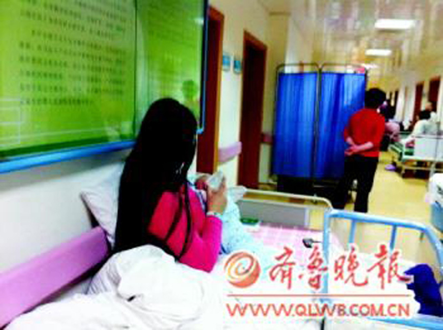 鳳凰網(wǎng)訊 3月27日凌晨,15歲的外省少女曉巖(化名)在煙臺(tái)毓璜頂醫(yī)院產(chǎn)下一個(gè)男嬰。醫(yī)生說,曉巖被送來時(shí)子宮口已經(jīng)全開,而她此前未做過任何產(chǎn)前檢查。年紀(jì)尚幼的她不知道如何喂養(yǎng)孩子,身邊也沒任何親屬陪同。據(jù)了解,男嬰的父親是一名33歲的搬運(yùn)工,兩人已戀愛一年多。目前,男友只給她送過兩頓飯。圖為小雪目前睡在毓璜頂醫(yī)院產(chǎn)科病房走廊的加床上。她今年15歲半,留著披肩發(fā),身高大約1.6米,身穿一件有些褪色的紅色毛衣。