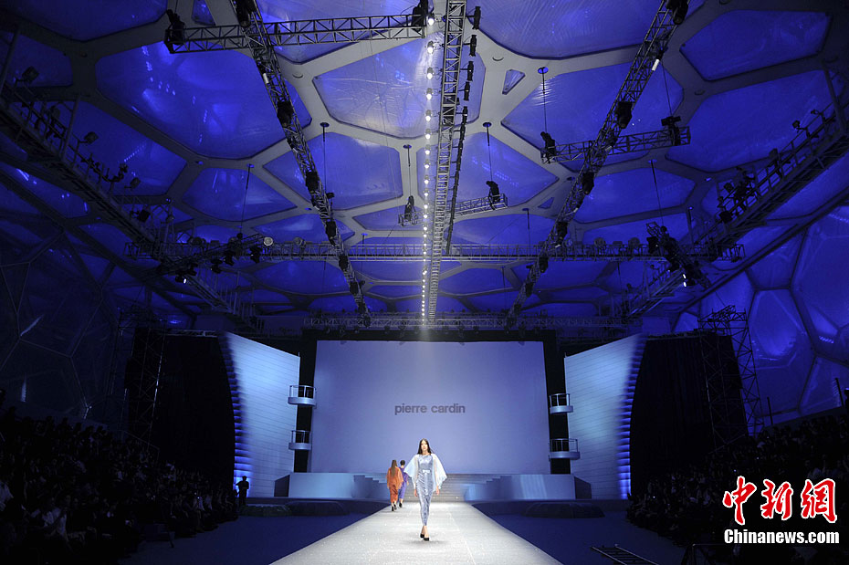 4月1日,服裝品牌皮爾·卡丹在北京水立方舉行時裝發布會,模特身穿發光時裝光影流動。中新社發 廖攀 攝