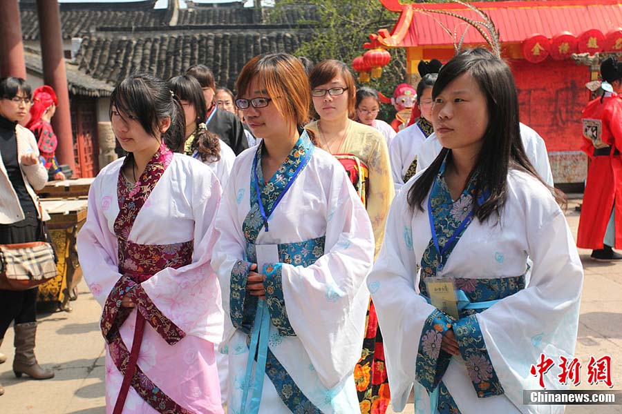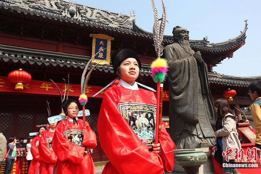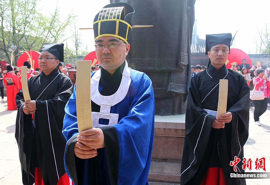 4月3日,南京夫子廟首次舉行春季祭孔大典。清明前夕,人們通過向至圣先師敬獻花籃、恭讀祭文、誦讀論語,表達對先圣、先賢、先祖美德的追思之情。中新社發 文寶 攝 圖片來源:CNSPHOTO