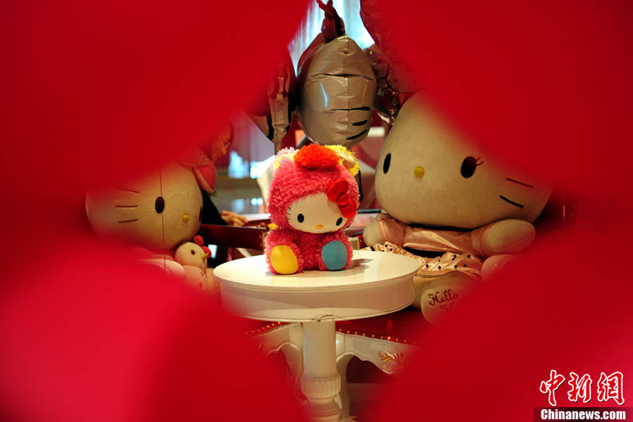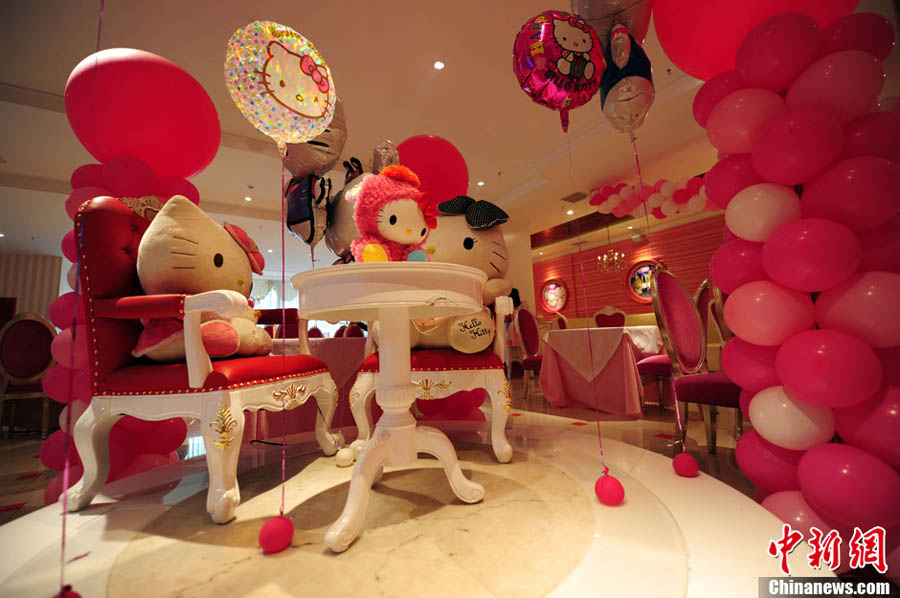 4月11日,亞洲首家經正式授權的日本卡通形象Hello Kitty主題餐廳落戶北京三里屯世茂百貨,顧客在主題餐廳品嘗菜品的同時,還可盡情感受Hello Kitty帶來的魔幻粉色氛圍。餐廳一般人均消費50元到80元不等,營業時間為每日11:00-21:00點。中新網記者 金碩 攝