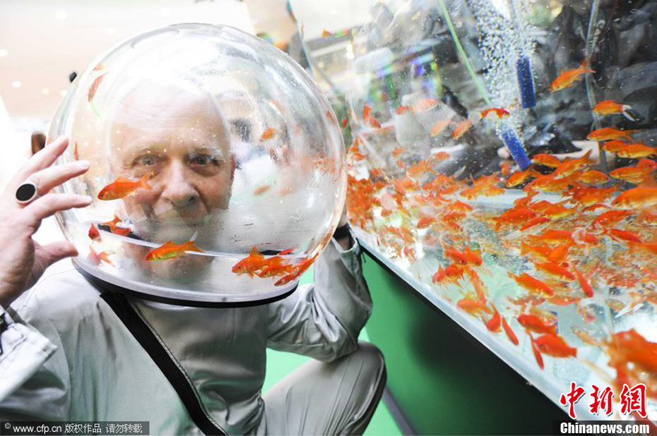 法國藝術家戴魚缸頭罩與魚同樂