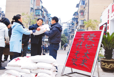 浙江省建德市新安江街道府東社區(qū)為困難家庭發(fā)放救助大米。