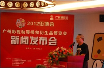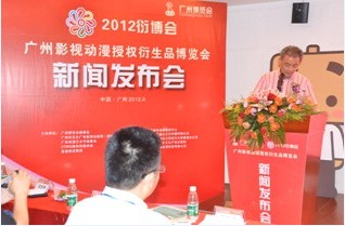 2012年8月3日下午,由廣州博覽會組委會辦公室、廣東動漫藝術(shù)節(jié)組委會、廣州市文化廣電新聞出版局、CTMG泰和文化傳媒機構(gòu)、香港泰成玩具集團聯(lián)合主辦,廣州市會展服務(wù)中心、廣州路通社文化傳播公司和北京艾迪動力影視公司承辦的廣州影視動漫授權(quán)衍生品博覽會(簡稱"衍博會" )在南方傳媒大廈南方文化產(chǎn)權(quán)交易所召開了新聞發(fā)布會。