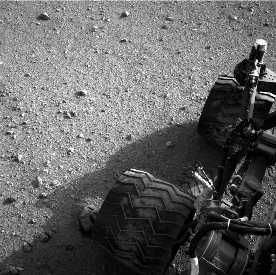 美國宇航局公布的一幅照片,展示了“好奇”號火星車的車輪,這幅照片是在第三次試車之后拍攝的。2012年8月5日,這輛六輪火星車順利在火星表面著陸,執行研究火星環境的考察任務