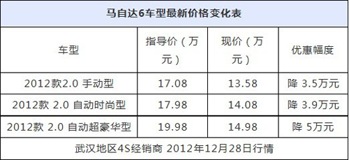 近日,從武漢地區一汽馬自達經銷商處了解到,目前店內馬自達6現車在售中,現在購車可享現金最高優惠5萬元。感興趣的朋友可以致電詳詢,詳情如下表: