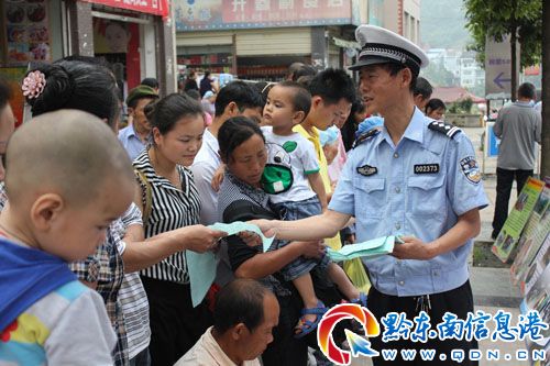 6月13日,岑鞏縣交警大隊在縣城擺攤設點開展“安全生產月”宣傳活動。民警紛紛走上街頭,向過往群眾發放了宣傳材料、接受群眾咨詢,解答群眾各類安全法規,受到群眾歡迎。圖為民警發放宣傳資料的情景。 (唐光新/攝)