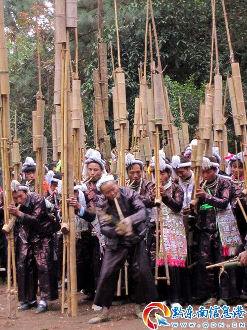 蘆笙節的前一天,全寨男女實行節前分工,男人組織殺牛、分肉到戶、婦女洗刷炊具,為節日這天準備了豐盛的菜肴,接待賓客。蘆笙節當天,招待好自家客人吃完中午飯后,全寨男女老幼身穿民族盛裝,邀賓客前往蘆笙堂參加蘆笙節。按照祖傳的規矩,各寨男人組成20——30人的蘆笙隊伍,在寨老的帶領下按規定的路線來到“跳坡”山腳,列隊面向太陽升起的方向,然后用倒退行走的方式緩緩從山下往山上移動。在行走時必須保持面向太陽不得扭頭轉身,否則被視為不誠心的表現,將得不到祖先的保佑。退到山頂,由一支持鳥槍的隊伍對空鳴放九響或十三響,儀式結束,進入蘆笙堂參加比賽,節日活動進入高潮。同時,全村還挑選10個槍手“全副武裝”,隨蘆笙隊伍行進并在演奏表演時鳴槍助興。頓時蘆笙聲、槍聲和人們的歡呼聲交織在一起,響徹林間,久久回蕩。(吳德軍)