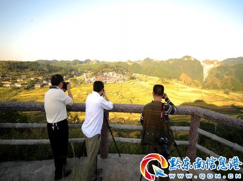 9月15日,貴州省丹寨縣龍泉鎮高要村,幾名攝影愛好者在拍攝高要梯田秋色
