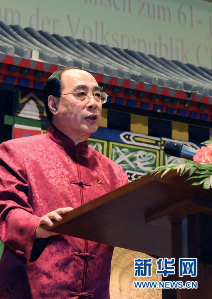 這是2010年9月29日在德國首都柏林的中國大使館,時任中國駐德國大使吳紅波在國慶招待會上致辭。 新華社發