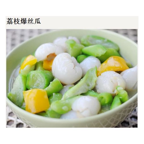 用料:荔枝、絲瓜、黃甜椒、油、鹽、雞精(可不加)