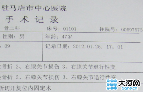 近日,駐馬店市驛城區金河辦事處小界牌村村民袁女士向大河網反映說,9月25日下午,她的丈夫曹現忠因鎖骨骨折在該市中心醫院做完手術后死亡,家屬催要病歷時值班醫生只找到了病歷夾子,上面只有床號無內容,過了近兩個小時,另一個人才拿來了病歷。