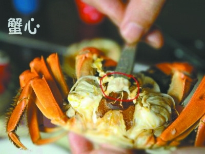 蟹心:黑膜下的“六角板” 中醫常說螃蟹極寒,而蟹心為最。蟹心是一個白色的六角形,它一般位于蟹中央一塊黑色膜衣下。