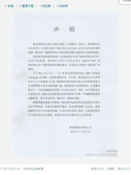 21日23點58分,酒鬼酒在官方認證微博上發出一則聲明稱,酒鬼酒股份有限公司衷心感謝廣大消費者、投資人、新聞媒體及社會各界人士長期以來給予我們的關心和支持。并“對近日發生的所謂酒鬼酒"塑化劑"超標事件給大家造成的困惑與誤解表示誠摯的歉意”。